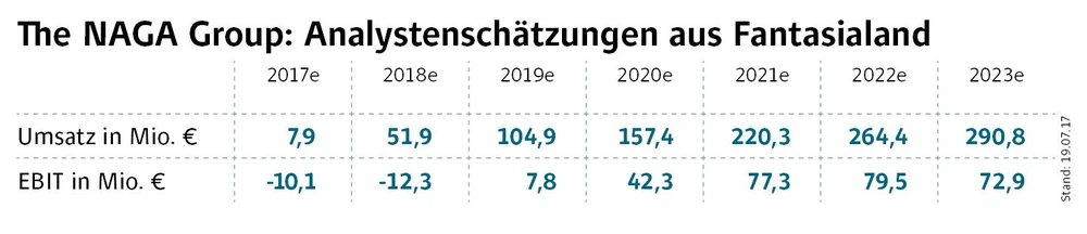 Die Zulassungsvoraussetzungen für den von der Deutschen Börse über einen langen Zeitraum geplanten Scale erfüllt die NAGA Group mit Ach und Krach. Nun stellen sich mehrere Fragen: Nämlich ob die Börsenreife, die ich von einem Start-up eigentlich gar nicht erwarte, vom Regulator, in diesem Fall der Deutschen Börse, tatsächlich geprüft wird und ob die Zulassungskriterien überhaupt die richtigen sind, um dem Anspruch, den Scale im Gegensatz zum Neuen Markt blütenweiß zu halten, auch gerecht zu werden. Denn das Schindluder, das bis vor einiger Zeit mit Schweizer 1-Rappen-Aktien-Buden im Freiverkehr getrieben wurde, war keinen Deut schlimmer als der NAGA-Börsengang. Ins Bild passen dabei auch die in nachfolgender Tabelle abgebildeten Analystenschätzungen für die NAGA Group, die reine Fantasiegebilde sind.