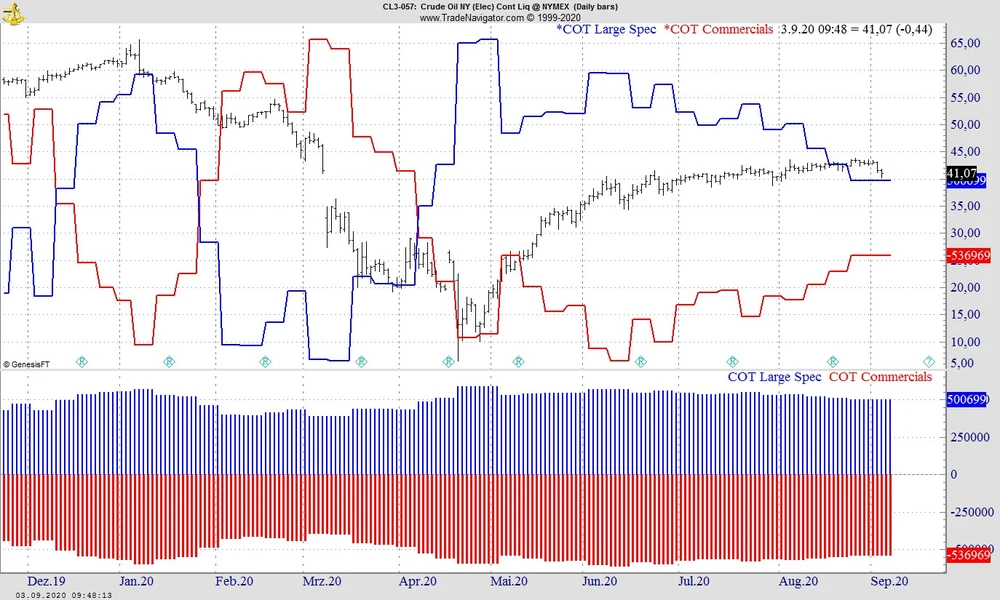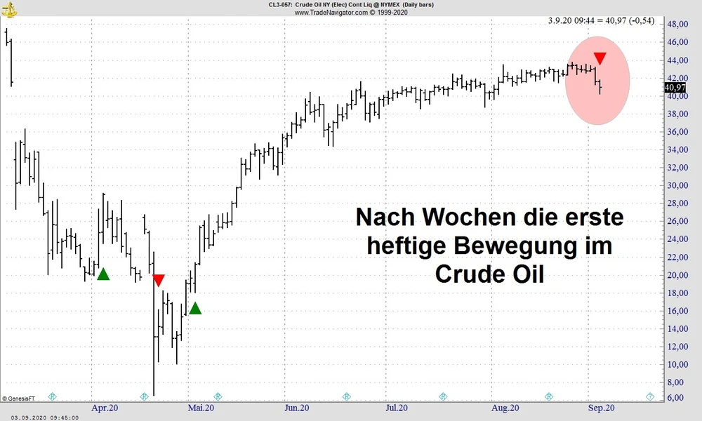 Wir erinnern uns noch gut an die vollkommen wilde Zeit im Crude Öl Handel, als es Anfang März 2020, mit dem Beginn der Corona Krise, zu einem unglaublichen Einbruch im Ölmarkt kam. Der Öl-Future war ein nicht mehr handelbares Volatilitätsmonster, mit Tagesschwankungen von mehr als 20 Prozent und einem negativen Mai Kontrakt, was alles bisher Dagewesene in den Schatten stellte. Seit Anfang Juni 2020 ist es jedoch zu einer Beruhigung gekommen und der Crude Öl Future handelt seit nunmehr 3 Monaten im Schlaftablettenmodus seitwärts um die 41 US-Dollar Marke. Am Mittwoch, 02.09.2020, brach der Oktober Kontrakt nach der Bekanntgabe der Öl-Inventories, die niedriger als erwartet ausfielen, in der Spitze um mehr als vier Prozent ein. Wir gehen von einem weiteren Rückgang im Crude Öl aus, da nach den niedriger als erwarteten Lagerbeständen, vermeintlich positive Nachrichten zum Verkauf genutzt werden und der bullische Effekt der Hurrikan-Saison auch limitiert sein dürfte.