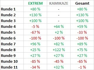 Die jüngst abgelaufene elfte Runde (gestartet auf dem Höhepunkt der Bärenmarktrally im August vergangenen Jahres) endete unter dem Strich kaum verändert. Zumindest zeitweise lagen die beiden im Dienst vereinten Depots EXTREM und KAMIKAZE 30 Prozent im Plus. Ein besseres Ergebnis verhinderte der Pullback des US-Marktes im Februar. Immerhin: Besonders mutige, im KAMIKAZE-Depot investierte Anlegerinnen und Anleger blieben bis zum Schluss belohnt!
