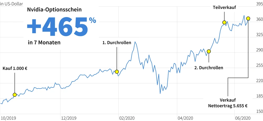 Beispiel Nvidia: Von 1.000 € auf 5.650 € in sieben Monaten mit durchgerollten Optionsscheinen