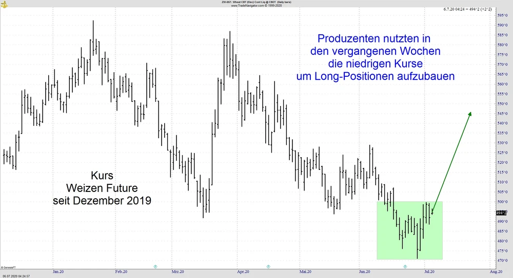 Die Bodenbildung im Getreidesektor ist abgeschlossen und Ende Juni lieferten auch die Fundamentaldaten weiteren Treibstoff für die anstehende Hausse. Ein deutlich besser als erwartet ausgefallener USDA Report verhalf Mais und Sojabohnen zum Sprung über die technischen Widerstände. Unser Top Pick im Getreide Sektor für den Monat Juli ist Weizen, hier sehen wir aktuell das größte Aufwärtspotential. Eine abgeschlossene Bodenbildung sowie die long Positionierung der Produzenten wird durch eine zu erwartende saisonale Kurssteigerung bestärkt.