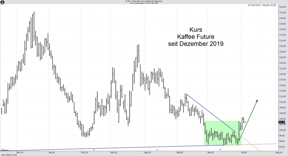 Im Soft Commodities Sektor ist der Kaffee unser Top Pick. Der dreimonatige Abwärtstrend seit Ende März wurde letzte Woche mit einem explosionsartigen Ausbruch über die wichtige Marke von 100 US-Cent verlassen. Hier stimmt nicht nur das technische Bild, sondern auch die Positionierung der Produzenten und die zu erwartende saisonale Entwicklung. Wir gehen von weiteren Kursteigerungen aus, da Bewegungen von über 30 Prozent in wenigen Wochen im Kaffee nicht ungewöhnlich sind.