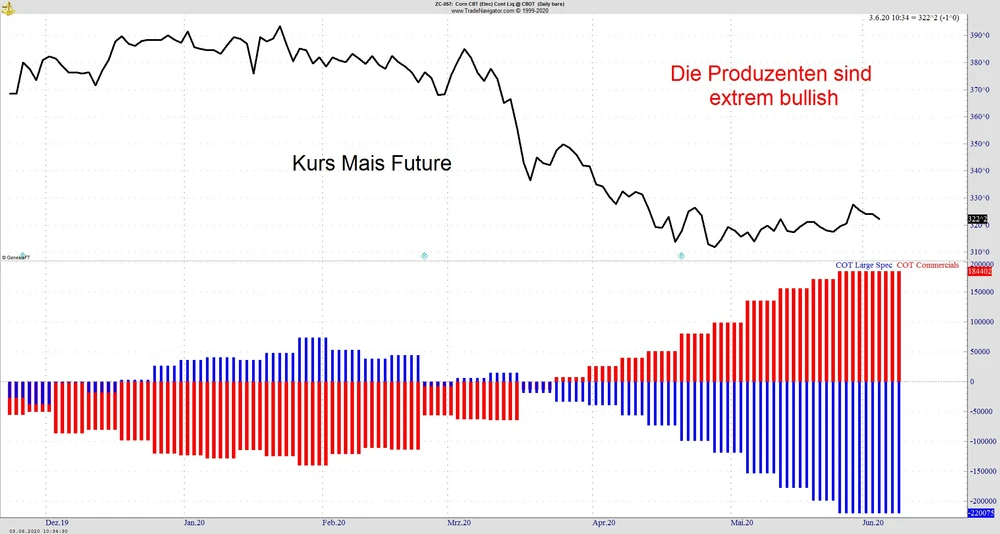 Mais steht vor einem Ausbruch nach oben. Nachdem am 21. April ein neues 6-Jahres-Tief bei 309 US-Cent erreicht wurde hat sich seitdem ein starker Boden ausgebildet. Auch wir vom ALGOreport sind bullish. Nicht nur unser bewährtes ALGO-GT-Signal hat auf Kauf gedreht. Mais konnte im Mai den steigenden Kursen von Erdöl und Ethanol noch nicht folgen, die Korrelation zwischen diesen Instrumenten ist aber sehr hoch und so ist mit steigenden Notierungen bei Mais zu rechnen. Die COT-Daten zeigen an, dass die Produzenten einen starken Kursanstieg erwarten und auch die saisonale Preisentwicklung ist positiv. Ein äußerst interessantes Trading-Setup, dass sich Rohstoff-Händler nicht entgehen lassen sollten.