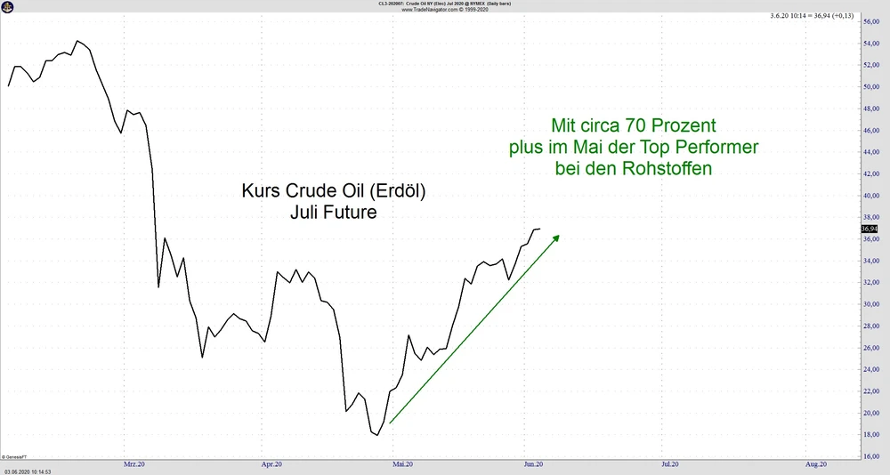 Der Energie-Sektor war der klare Gewinner bei den Rohstoffen, wobei das im April noch stark gebeutelte Crude-Öl (Erdöl) mit einem Monatsplus von circa 70 Prozent den Vogel abgeschossen hat. Auf dem zweiten Platz RBOB (Benzin) mit einem beachtlichen Plus von 34 Prozent, Heizöl konnte immerhin noch 16 Prozent zulegen. Nach den imposanten Kursgewinnen im Mai gehen wir von einem begrenzten Aufwärtspotenzial in den nächsten Wochen aus. Eine drohende saisonale Schwäche sowie eine weitere Vergrößerung der Shortpositionen bei den Produzenten stimmen uns vorsichtig.