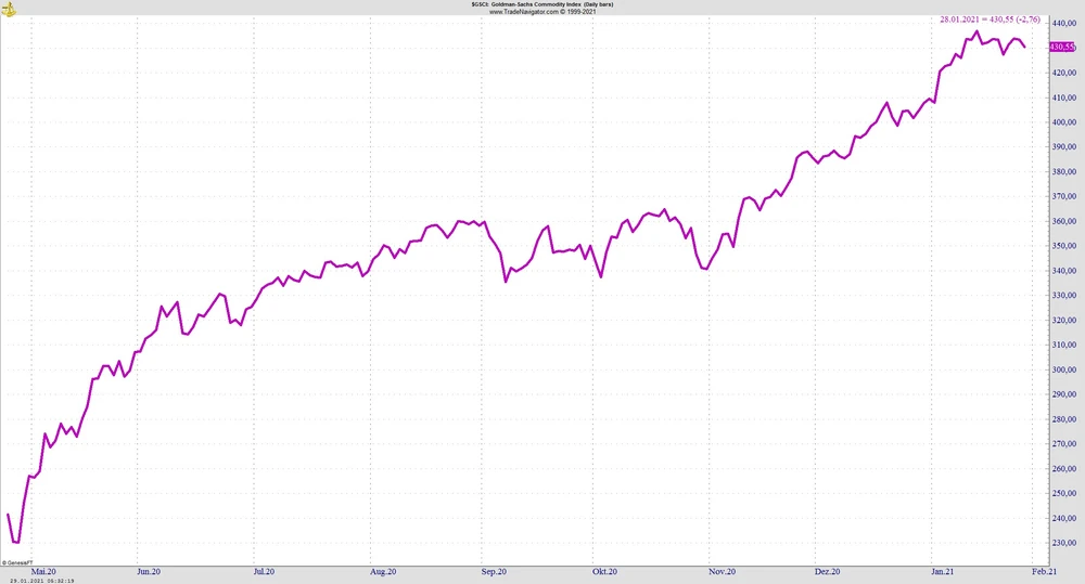 Rohstoffe sind aktuell gefragt: ob man baut oder einfach nur Waren im Internet bestellt. Jeder spürt, dass Preise steigen und Lieferzeiten länger geworden sind. Bereits im November 2020 hatte die weltweite Produktion die pandemiebedingten Verluste wieder aufgeholt. Im Dezember lag das Warenhandelsvolumen schon wieder 1% über dem Vorjahresniveau. Und das obwohl sich der Dienstleistungssektor weltweit in vielen Ländern noch immer im "Lock-Down-Modus" befindet.