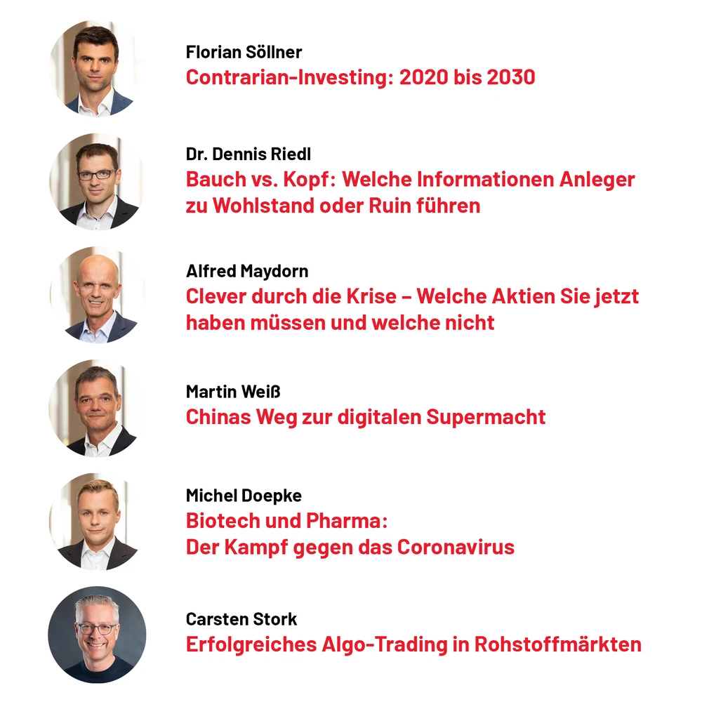 Biotech- und Pharma-Experte Michel Doepke informiert über die potenziellen Corona-Profiteure, während Martin Weiß die digitale Revolution in China und die sich daraus ergebenden Chancen für Privatanleger beleuchtet.