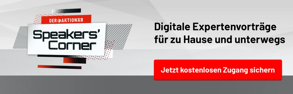 Informative Hintergrundberichte, ausführliche Analysen, überzeugende Anlagestrategien, konkrete Handlungsempfehlungen. DER AKTIONÄR bietet Privatanlegern den Mehrwert, den sie für ihre Investitionsentscheidungen brauchen. Tagesaktuell auf www.deraktionaer.de oder bei AKTIONÄR TV, wöchentlich in Deutschlands führendem Börsenmagazin. Mit der Speakers’ Corner erschließt DER AKTIONÄR Privatanlegern jetzt eine weitere, digitale Informationsquelle.