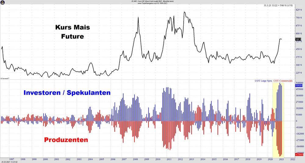 Nach wie vor sind amerikanische Hersteller und Produzenten von Mais und Sojabohnen extrem skeptisch bezüglich weiter steigender Preise. Im Mais halten sie eine Short-Position von Minus 478.665 Kontrakten, in den Sojabohnen von Minus 212.051 Kontrakte. Solch extreme Positionierungen haben in der Vergangenheit schon mehrmals starke Kursverluste in beiden Märkten ausgelöst.