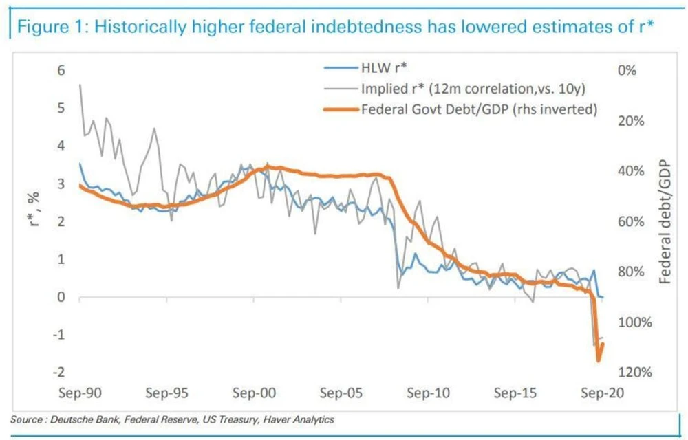 Holston von Harvard und Laubach und Williams von der Fed haben ein Modell entwickelt (HLW) eine Näherung für diesen Zinssatz zeitnah aus Wirtschaftsdaten zu berechnen. Eine andere Methode diesen Zinssatz zu schätzen ergibt sich aus der Zinsdifferenz zwischen dem kurzen Satz und dem für langfristige Ausleihungen. Nähern sich diese beiden Zinsen an, schwächt sich die Wirtschaft ab, weitet sich die Spanne aus, beschleunigt sie sich. Und nun die Überraschung: Die beiden Kurven des neutralen Zinses verlaufen etwa parallel zu der inversen Höhe der Staatsschuld.