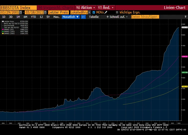 Ein Credit-Suisse-Analyst sieht wegen des Gelddruckens und der Beschlagnahmung von russischem Zentralbankgeld eine Zäsur und „New World Monetary Order“. Chinesen würden nun mit Dollar lieber Rohstoffe aufkaufen. Bei K+S kommt hinzu, dass Uralkali und Belaruskali nicht mehr zuverlässig in den Westen liefern. Ein Insider sagt mir: „Die Preise für Dünger explodieren.“ Ein Drittel sei der Preis inoffiziell in wenigen Wochen gestiegen. Auch das Benzin verdoppelt sich, Hauspreise alle paar Jahre. Ähnlich extrem: Die Entwicklung der EZB-Bilanzsumme in den letzten 20 Jahren.
