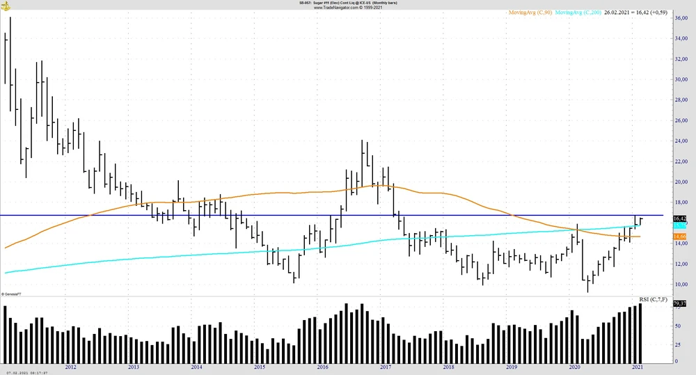Nach dem kurzen Rücksetzer im November 2020 um zehn Prozent konnte der Zucker-Future Ende Dezember wieder Gas geben und markierte am 14. Januar ein neues Dreijahreshoch bei 16,73 Cent. Das war der höchste Stand im Zucker-Future seit April 2017. In den vergangenen Wochen hat der Kurs etwas konsolidiert und am vergangenen Freitag, den 5. Februar, einen neuen Anlauf gestartet: Ein neues Hoch ist wieder zum Greifen nah.