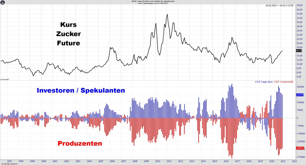 Ein genauer Blick auf die Commitments-of-Traders-Daten zeigt, dass die Produzenten skeptisch sind. Die Short-Positionen sind zwar etwas kleiner geworden, aber immer noch auf einem extremen Level. Die Gegenseite wird von bullishen Anlegern gehalten. Diese Konstellation war auch 2016 ähnlich, danach erfolgte ein Kurseinbruch um fast 60 Prozent.
