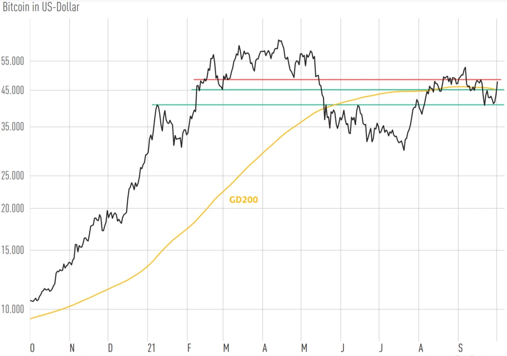 Die digitale Leitwährung schießt am Freitag um mehr als zehn Prozent nach oben und erobert dabei die Marke von 47.000 Dollar zurück. Wichtige Chartmarken auf dem Weg dorthin wie die horizontale Widerstandszone im Bereich zwischen 44.000 und 45.000 Dollar oder die 200-Tage-Linie knackt der Bitcoin dabei spielend. Er hat außerdem den Monatsverlust von gut sieben Prozent im September innerhalb von Minuten ausgeglichen und notiert nun wieder auf dem Niveau von Ende August.