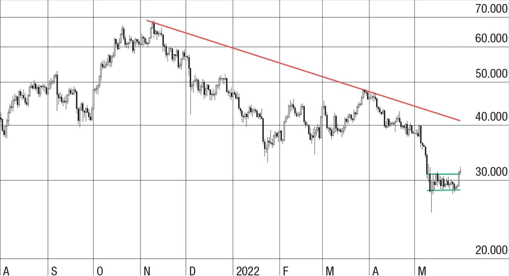 Auf diesem Niveau notiert der Kurs bereits knapp oberhalb der Seitwärtsrange im Bereich zwischen 31.300 und 28.500 Dollar, die in den vergangenen zwei Wochen das Chartbild geprägt hat. Erweist sich der Ausbruch als nachhaltig, wäre das ein Indiz für eine fortschreitende Stabilisierung und ein weiterer Schritt in Richtung eines Comebacks.