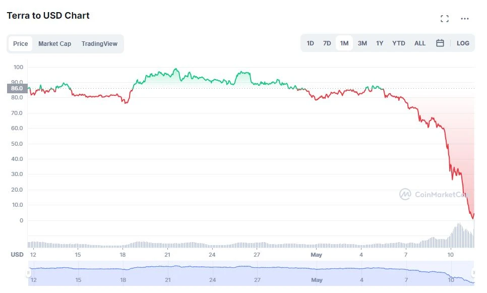 Nachdem der algorithmische Stablecoin TerraUSD (UST) jüngst die Koppelung an sein 1-Dollar-Ziel verloren hatte, steht das Projekt vor dem Aus. Das hat auch unmittelbare Folgen für den Schwerster-Coin Terra (LUNA), der eigentlich für Stabilität und Liquidität sorgen soll. Der Kurs von LUNA bricht alleine am heutigen Tag um bis zu 95 Prozent ein.