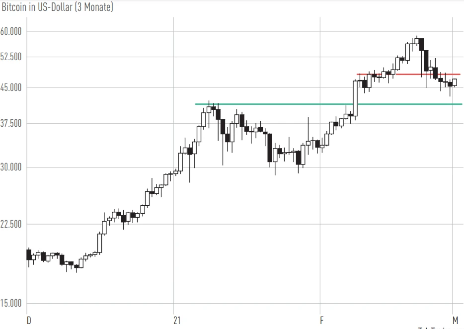 Zwar notiert der Bitcoin auf diesem Niveau etwa 20 Prozent unter dem jüngsten Allzeithoch von 58.300 Dollar. Aus charttechnischer Sicht ist der dynamische Aufwärtstrend der vergangenen Monate ist damit weiterhin intakt. Zudem hilft die Korrektur, die überkaufte Situation nach dem nahezu parabolisch anmutenden Anstieg der letzten Wochen zu entspannen.