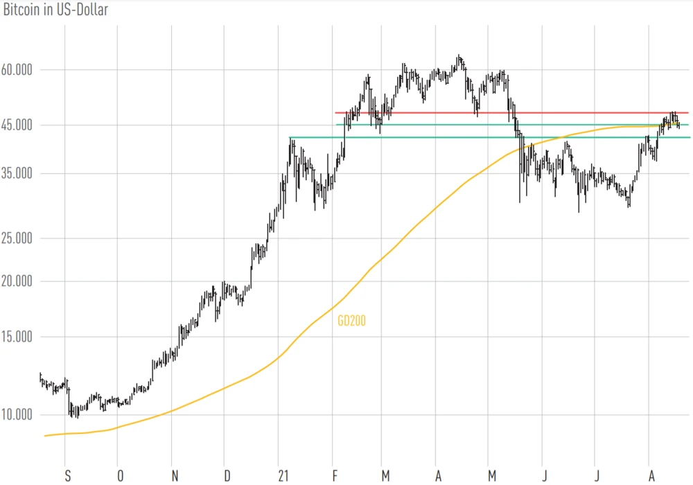 Am Wochenende hatte der Bitcoin den horizontalen Widerstand bei rund 48.000 Dollar kurzzeitig schon überwunden und zu Wochenbeginn noch einmal ins Visier genommen. Für einen nachhaltigen Ausbruch hat es bislang aber noch nicht gereicht. Stattdessen ist er kurzzeitig sogar unter die Unterstützung bei rund 45.000 Dollar gerutscht.