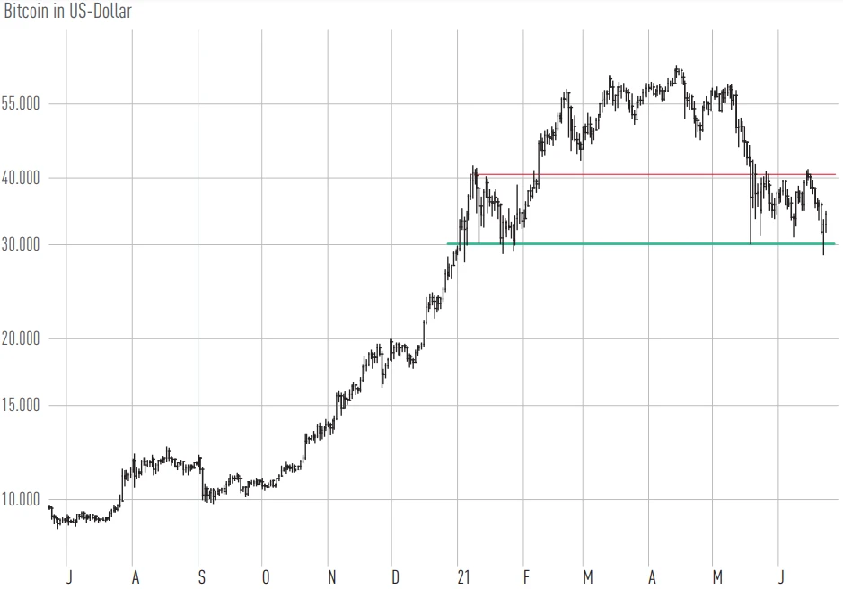 Die digitale Leitwährung befindet sich nun wieder in ihrem Seitwärtskanal zwischen 30.000 und 40.000 Dollar, der in den vergangenen Wochen das charttechnische Geschehen geprägt hat. Damit sich das Chartbild deutlich aufhellt und die Rallye weitergehen kann, wäre allerdings ein nachhaltiger Ausbruch über die obere Begrenzung der aktuellen Trading-Range oberhalb von 40.000 Dollar nötig.