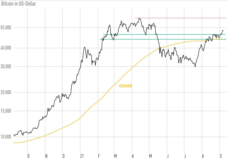 Der Start in den September 2021 fällt im Vergleich dazu äußerst vielversprechend aus. Seit Monatsbeginn hat die digitale Leitwährung bereits rund 11,6 Prozent zugelegt. Noch viel wichtiger als der prozentuale Kursgewinn ist allerdings, dass damit auch wichtige Chartmarken zurückerobert wurden.