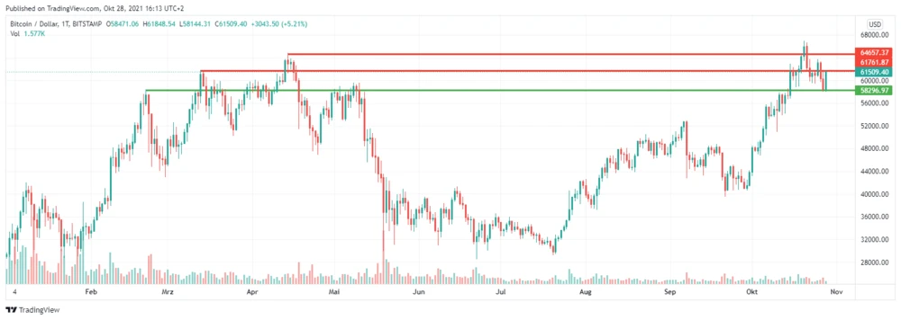 Auf dem aktuellen Niveau ringt er nun mit einem horizontalen Widerstand, an dem er bereits im März auf dem Weg zum damaligen Rekordhoch bei rund 64.900 Dollar zunächst abgeprallt war. Gelingt ein Ausbruch, rücken als nächstes das April-Hoch sowie das Allzeithoch aus der Vorwoche bei 66.930 Dollar in den Fokus.