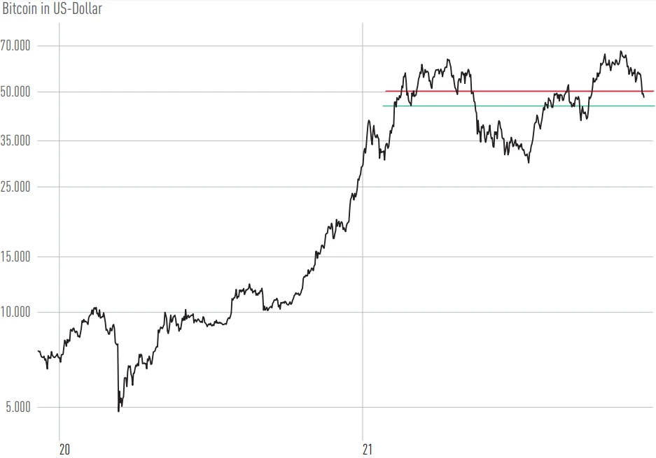 Der Bitcoin hat in der Nacht auf Samstag zeitweise rund 20 Prozent verloren und ist dabei kurz sogar unter die Marke von 44.000 Dollar abgetaucht. Die Flucht aus riskanteren Assets hat dabei ein Deleveraging von teils stark gehebelten Positionen ausgelöst, was die Talfahrt zusätzlich beschleunigt hat. Nach Daten des Portals coinglass.com wurden am Wochenende Long-Positionen im Volumen von rund 2,3 Milliarden Dollar liquidiert.