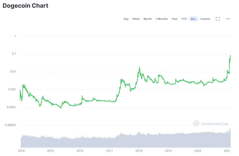 Dogecoin ist der witzige Underdog unter den Kryptowährungen, hat es in dieser Woche zeitweise aber sogar in die Top 10 nach Market Cap geschafft. Enorme Höhenflüge gab es in der Vergangenheit immer wieder. Früher oder später ist der Coin jedoch meist eher unsanft auf den Boden der Tatsachen zurückgekehrt.