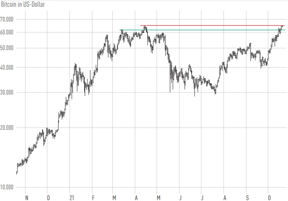 Ein Sprung auf neue Hochs ist daher nur noch eine Frage der Zeit. Kurzfristig könnten darauf zwar Gewinnmitnahmen folgen. Mittel- und langfristig dürfte die Aufwärtsbewegung des Bitcoin anschließend aber weitergehen. Investierte Anleger lassen daher die Gewinne laufen und auch mutige Neueinsteiger können noch auf den Ausbruch setzen.