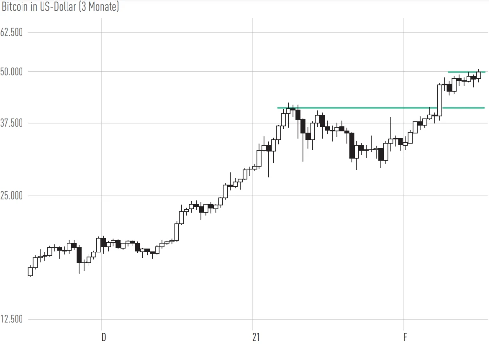 Im dritten Anlauf hat es geklappt: Der Bitcoin hat am Dienstagnachmittag erstmals die Marke von 50.000 Dollar hinter sich gelassen und bei 50.341 Dollar ein neues Allzeithoch markiert. Alleine seit Jahresanfang beläuft sich das Kursplus damit auf rund 75 Prozent. Und ein Ende der Rallye scheint zunächst nicht in Sicht.