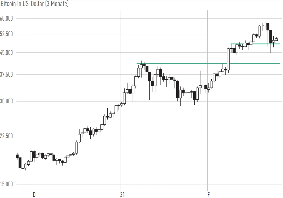 Auch der Bitcoin-Kurs selbst war in den vergangenen Tagen massiv in Bewegung: Nach dem neuen Allzeithoch bei 58.330 Dollar vom Wochenende ist er zeitweise um über 20 Prozent eingeknickt. Inzwischen konnte er sich allerdings stabilisieren und die Marke von 50.000 Dollar zurückerobern. Damit steht der Bitcoin immer noch fast fünfmal höher als vor einem Jahr und rund 70 Prozent höher als zu Jahresbeginn.