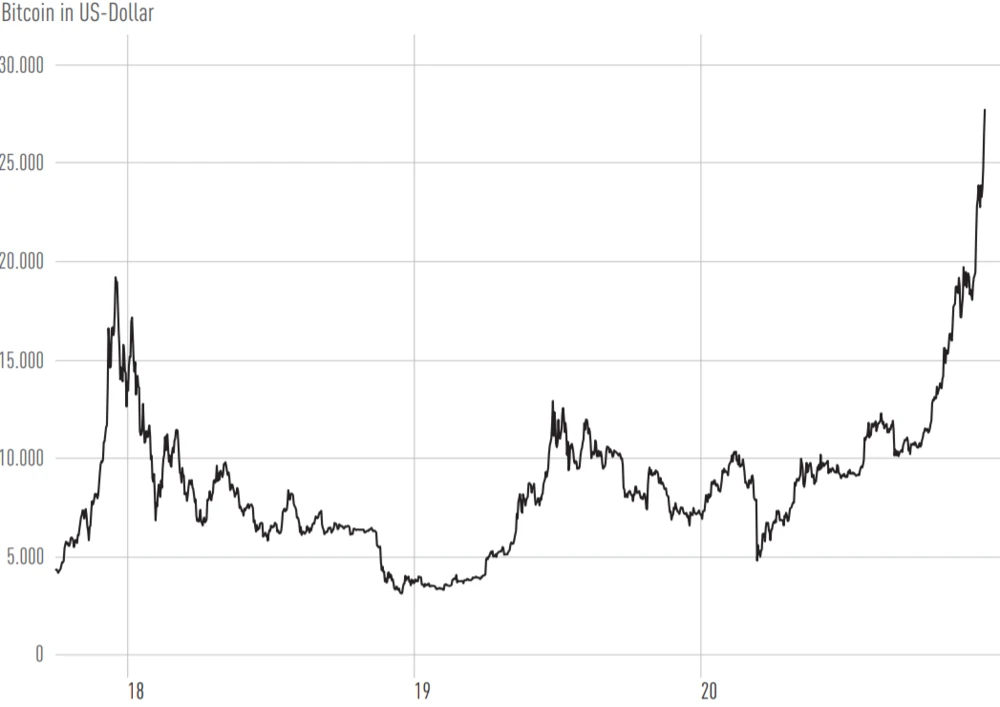 Die laufende Aufwärtsbewegung hat in den vergangenen Tagen endgültig historische Ausmaße angenommen: Nicht nur, dass der Bitcoin-Kurs bei rund 27.634 Dollar ein neuer Allzeithoch erreicht hat. Er hat dabei auch rekordverdächtig schnell an Wert gewonnen.
