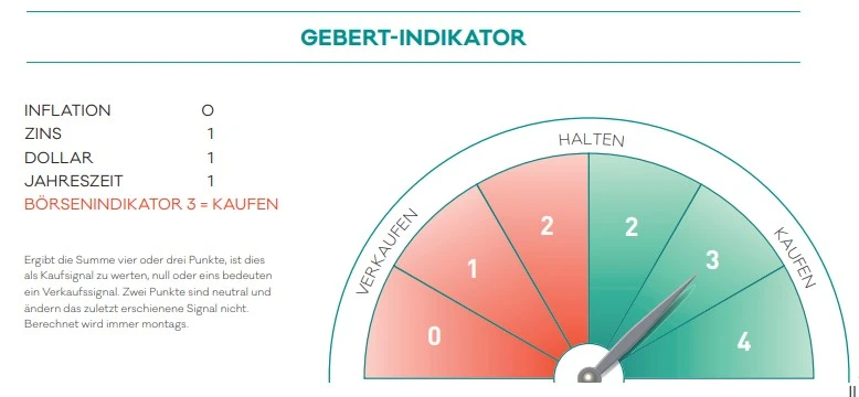 Zum ersten Mal wurde der von Thomas Gebert entwickelte Indikator im Buch "Börsenindikatoren" beschrieben, das später mit zwei weiteren Büchern zu "Der große Gebert" zusammengeführt wurde. Nach einem Vier-Punkte-System wird entschieden, ob in Aktien investiert wird. Ab drei Punkten – so wie aktuell – wird bereits ein Kaufsignal generiert (siehe Grafik). In diesem Fall wird nach dem Prinzip der Relativen Stärke in die zehn Aktien der 100 umsatzstärksten deutschen Unternehmen investiert.