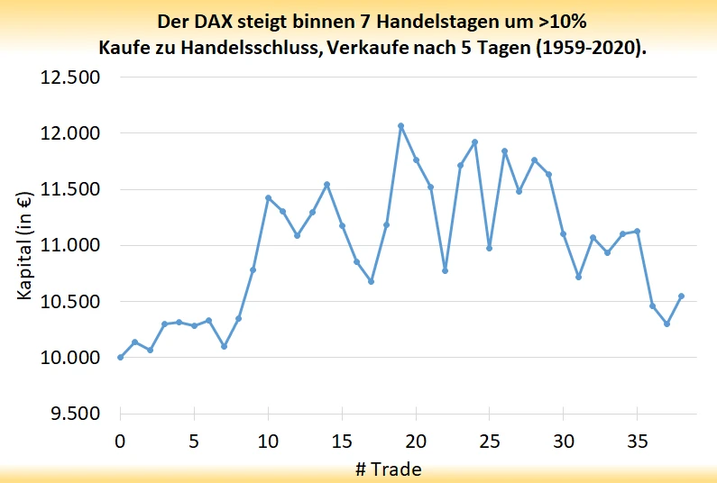 Ergo: Die Statistik zeigt, dass es auch auf diesem stark erhöhten Niveau keinen systematischen Vorteil für die Bären gibt. In der Tendenz hat sich der DAX in den darauffolgenden Tagen sogar weiter verbessert. Die folgende Grafik zeigt exemplarisch die Kapitalentwicklung, wenn man immer nach diesem Ereignis eingestiegen wäre und den DAX eine Woche (fünf Handelstage) gehalten hätte: