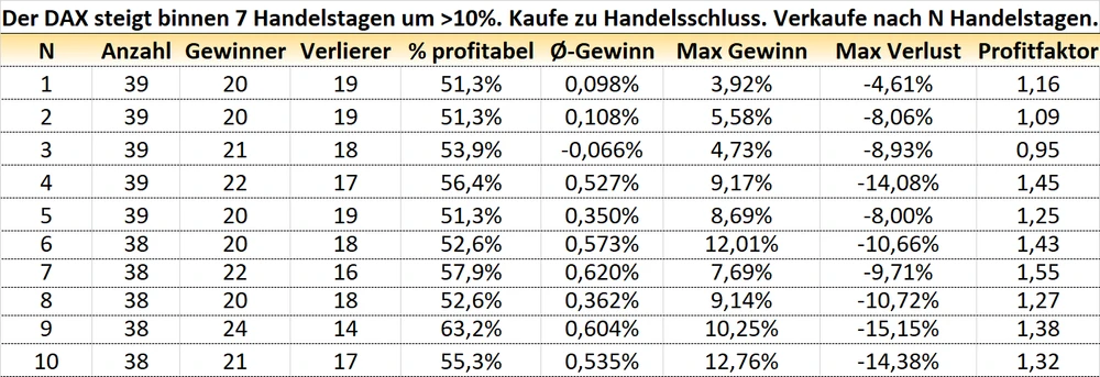 Der DAX gibt aktuell mächtig Gas. Während mittelfristige Indikatoren allmählich in „heißen“ Bereichen ankommen (z.B. RSI gestern bei 71), scheinen die größten deutschen Aktien weiter keine Widerstände zu kennen. In der Geschichte hat der DAX es bereits 39 mal fertigbekommen, innerhalb von maximal sieben Tagen prozentual zweistellig zuzulegen. Und so ging es in der Folge weiter: