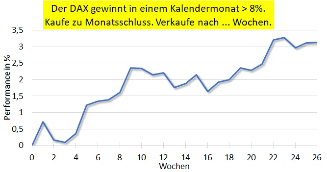 Die Grafik zeigt die durchschnittliche Entwicklung des DAX in den Wochen nach dem Monat, der mindestens einen 8%-Anstieg eingebracht hat. Das typische Muster ist demzufolge also eine mehrwöchige Konsolidierung mit einer anschließenden Fortsetzung des Aufwärtstrends.