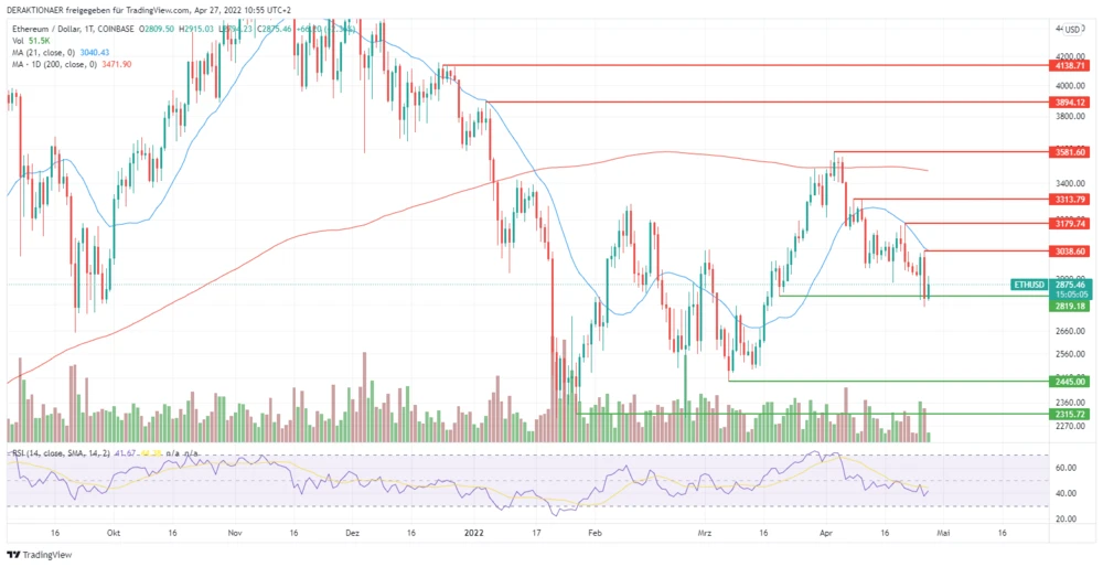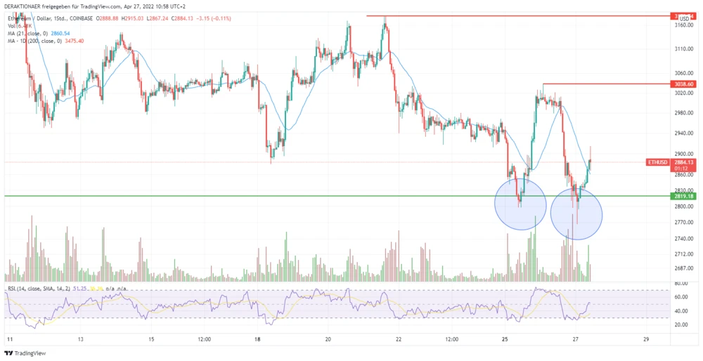 Ein erstes Zeichen der Entspannung findet sich im Stunden-Chart. Hier ist zu erkennen, dass ein Doppelboden in den vergangenen drei Handelstagen gebildet wird und die Bullen am heutigen Mittwoch einen neuen Erholungsversuch einleiten. Wichtig ist jetzt, dass die Unterstützung weiterhin standhaft bleibt und ETH möglichst zeitnahe die psychologisch wichtige 3.000-Dollar-Marke zurückerobert.