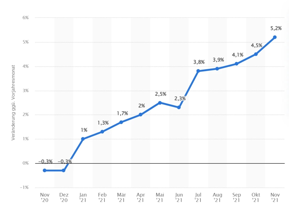 Die Jahresinflation 2021 liegt bei 3,1 Prozent, das ist der höchster Stand seit fast 30 Jahren. Das Leben in Deutschland hat sich im vergangenen Jahr sprunghaft verteuert. Kräftig gestiegene Energiepreise, Lieferengpässe sowie die Rücknahme der zeitweisen Mehrwertsteuersenkung trieben die Jahresinflation nach einer ersten Schätzung des Statistischen Bundesamtes immer weiter nach oben.