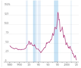 Die eine Linie sieht aus, wie die andere auf den Kopf gestellt. Während von 1920 bis 1945 die Verschuldungen – kriegsbedingt – anstiegen, fielen die Anleiherenditen zurück. Der Schuldenabbau von 1945 bis 1980 führte dagegen zu einem Anstieg der durchschnittlichen Zinsen von 2,5 Prozent auf 12,5 Prozent. Die erneuten Schuldenorgien seit 1980 ließen kurioserweise die Anleiherenditen wieder sinken, bis fast gegen null Prozent vor der Pandemie.