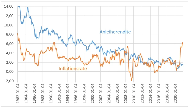Gab es in den USA 1988 bei einer Rendite von acht Prozent für eine zehnjährige Staatsanleihe und einer Teuerungsrate von vier Prozent noch eine reale Verzinsung von vier Prozent, schrumpfte dieser zu erzielende Ertrag in den folgenden Jahrzehnten auf null Prozent vor der Pandemie. Mittlerweile muss sich der Anleihekäufer sogar mit einer negativen realen Rendite von über minus vier Prozent abfinden.