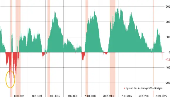 Ein solcher Zustand, den man inverse Zinskurve nennt, tritt nicht oft auf. Aber wenn er auftritt, ist er ein genauer Indikator für einen Rückgang des BIP. In den USA ist es seit Ende der 1970er-Jahre jedes Mal nach einer inversen Zinskurve zu einer Rezession gekommen.