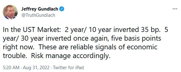 Gundlach hat bereits im März Anlegern geraten, die Umkehrung der Renditekurve genau zu beobachten und betonte, dass dies von Bedeutung sei. „Pünktlich zum richtigen Zeitpunkt erscheinen die Weißbücher mit der Aufschrift 'It Doesn't Matter This Time'. Glauben Sie ihnen nicht“, twitterte er. Während seines Webcasts für Anleger sagte Gundlach, dass die Umkehrung der 2- und 10-jährigen Renditen in den letzten vier Fällen erfolgreich wirtschaftliche Abschwünge vorhersagte.