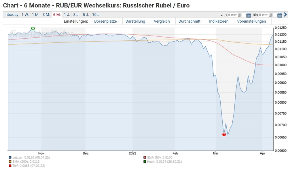 Die Rubel-Rally nimmt vor dem Wochenende erneut an Fahrt auf. Ein Rubel kostet nun 0,012 Euro und hat damit seit dem historischen Tief bereits rund 50 Prozent aufgeholt (siehe Chart). Die Euroland-Währung verbilligt sich kurzzeitig in der Spitze um über drei Prozent auf 79,11 Rubel. Zuletzt notiert der Euro bei 83 Rubel.