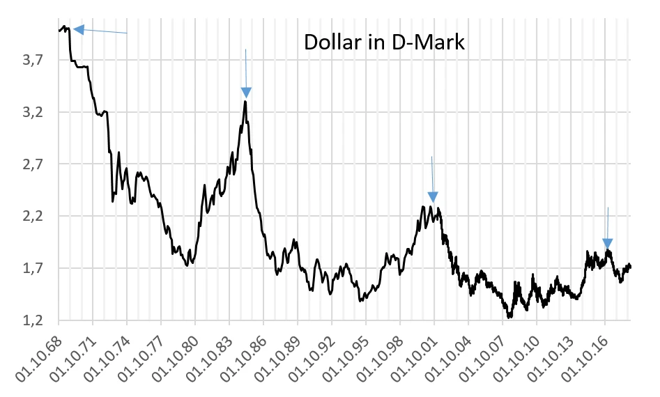 Diese Strategie beruht auf dem 16-jährigen Dollar-Zyklus. Alle 16 Jahre markiert der US-Dollar gegen die deutsche Währung einen Gipfel. In der nächsten Grafik habe ich einmal den Dollar gegen die alte D-Mark beziehungsweise den in D-Mark umgerechneten Euro seit 1969 aufgetragen.