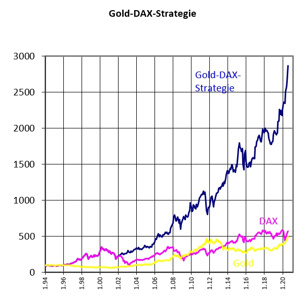 Im Sommer 2017 habe ich im Börsenbrief eine Strategie vorgestellt, die ich noch einmal kurz erläutern möchte – die Gold-DAX-Strategie. Sie wechselt im achtjährigen Rhythmus von Aktien in Gold und wieder zurück in Aktien. Zu Beginn des Jahres 1994 waren die Aktien an der Reihe. Zum Jahresstart 2002 wurden die Aktien verkauft und Gold dafür gekauft.