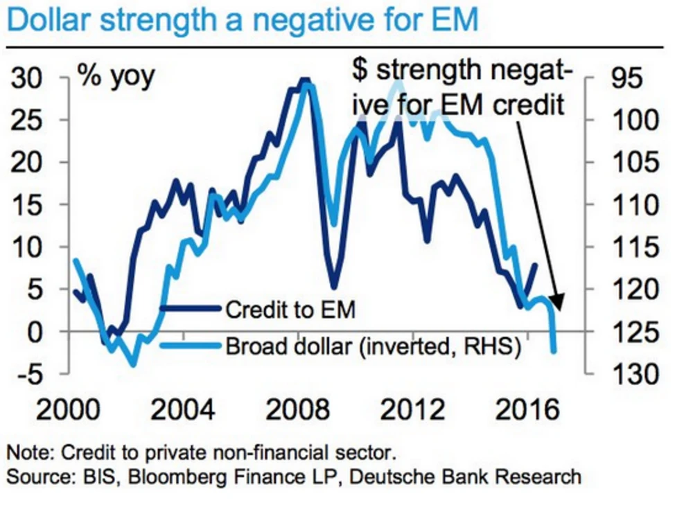 In dunkelblau ist auf der linken Achse das Kreditwachstum der sich entwickelnden Länder aufgetragen und in hellblau der auf den Kopf gestellte Dollar-Index (oben im Bild bedeutet also Dollarschwäche und unten Dollarstärke, deswegen läuft die rechte y-Achse auch von 130 bis 95). So ergibt sich aus den Kapitalflüssen der Dollar-Zyklus, der die Kapitalmärkte regiert.