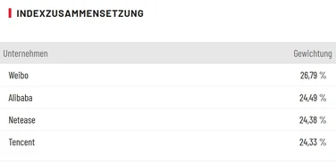Im WANT-Index sind die vier großen China-Aktien Weibo, Alibaba, NetEase und Tencent in einer weitgehend gleichen Gewichtung zusammengefasst. Der Kurznachrichtendienst Weibo liegt derzeit mit 26,8 Prozent an der Spitze.