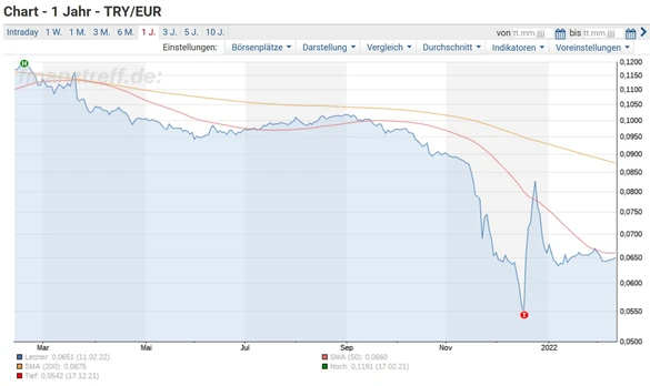 Im Januar verzeichnete das Land am Bosporus eine Inflationsrate von fast 50 Prozent. Als Hauptgrund für den starken Anstieg der Verbraucherpreise gilt die lockere Ausrichtung der türkischen Geldpolitik. Trotz der hohen Inflation hat die türkische Notenbank im vergangenen Jahr den Leitzins mehrfach gesenkt, auf zuletzt 14,0 Prozent.