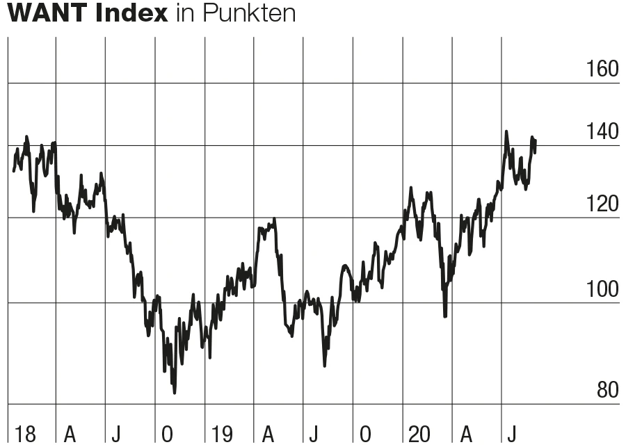 Im Corona-Crash war der WANT Index bis auf 97,09 Punkte gefallen. Doch seitdem befindet sich das Aktienbarometer wieder in einem intakten Aufwärtstrend. Seit dem März-Tief beträgt das Kursplus satte 46 Prozent. Auch das Allzeithoch vom 9. Juli bei 146,62 Punkten ist nicht mehr in weiter Ferne. Aufgrund der sich zuletzt wieder robust präsentierenden Wirtschaft in China könnte ein neues Rekordhoch schon bald erreicht werden. DER AKTIONÄR hat in Ausgabe 19/2020 ein Long-Zertifikat mit der WKN MC6CNU auf den WANT Index empfohlen. Seitdem hat das Papier rund 34 Prozent zugelegt. DER AKTIONÄR passt nun Ziel- und Stoppkurs an. Neues Ziel: 12,50 Euro. Neuer Stopp: 7,00 Euro.