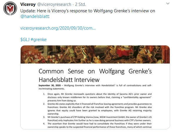 Das Interview sei am Ende wieder nur ein weiterer Versuch, die eklatanten Probleme zu beschönigen, die in dem Bericht seiner Firma Viceroy Research aufgezeigt wurden. Er bekräftigt daher seine negative Einschätzung zur Grenke-Aktie.