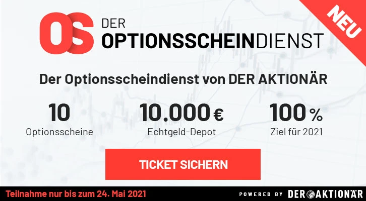Genau dieser Hebeleffekt wird jetzt auch im neuen Börsendienst von DER AKTIONÄR genutzt. „Der Optionsscheindienst“ von DER AKTIONÄR tritt an, um mehr für Sie herauszuholen. Mit der gebündelten Expertise der AKTIONÄR-Redaktion, einem 10.000-Euro-Echtgeld-Depot und bis zu 10 ausgewählten Optionsscheinen wird noch in diesem Jahr das Ziel Verdopplung ins Visier genommen.