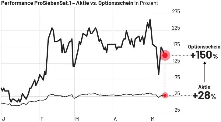 Doch die ganze Überlegenheit von Optionsscheinen zeigt sich erst im Vergleich mit einem identisch aufgestellten Aktiendepot: Während die Aktie von ProSiebenSat.1 von Januar bis Mai 2021 gute 28 Prozent zulegte, entfaltete der Hebel des Optionsscheins seine volle Kraft, ging mit einer Performance von 150 Prozent durch die Decke und lieferte den Anlegern eine über fünffache Outperformance.